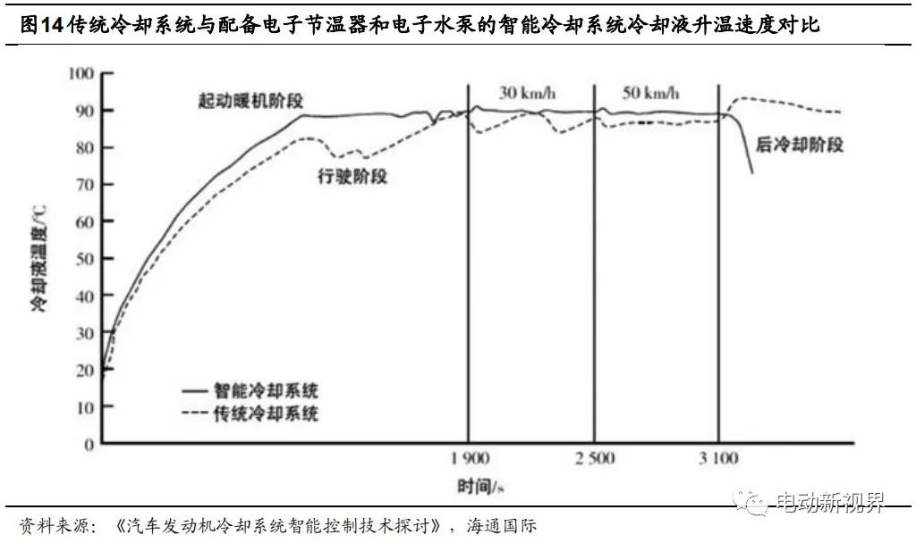 電動水泵能夠從根本上解決了這個問題,電動水泵可以根據發動機不同的工況通過 ECU 控制實現開關,尤其在發動機冷起動階段,電動水泵可以停止泵水,從而使發動機內部冷卻液處在小循環,實現快速升溫,以達到快速暖機的效果。另一方面,電動水泵也可以與電子節溫器配合使用,以達到更好的冷卻控制效果,實現快速暖機。
