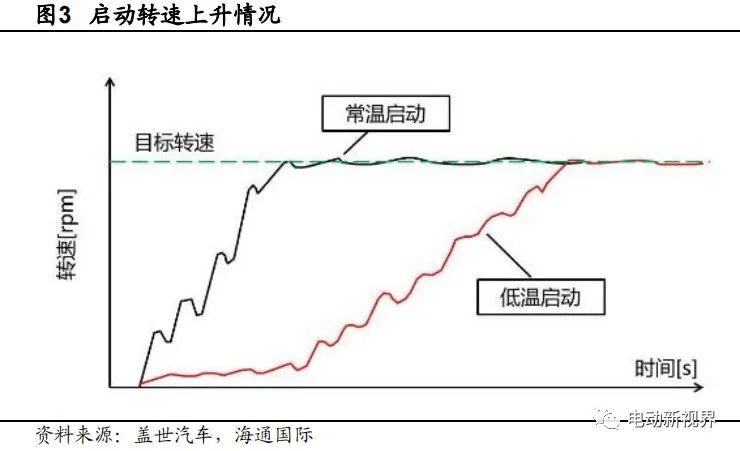 而在冬季寒冷地區,比如東北-35℃下,汽油的霧化性極差,啟動時必須噴射遠高于正常啟動的油量才能夠獲得有條件燃燒的混合氣,并且點火困難,低溫啟動時間明顯較長,一般來說-35℃在 15s 內啟動成功都屬正常現象,缸內直噴對于冷啟動性能會有所改善。由于機油溫度很低,粘度變大,在低溫工況下很難快速潤滑發動機各零部件,所以需要時間來提升油溫;另外一方面,發動機內部各零件的間隙較大,需要經過時間預熱,預熱膨脹后才能逐步達到規定間隙,如果在機油輸送和油壓建立的過程中,部件之間尚未形成油膜,尤其是缸蓋中的氣門液壓挺柱,需要經歷充油的過程,此時氣門間隙較大,氣門閉合落座時將產生正常的機械“噠噠”聲。冷啟動困難引起的機械磨損對于發動機的影響是非常嚴重的,發動機 80\%以上的磨損都是在冷啟動階段造成的。