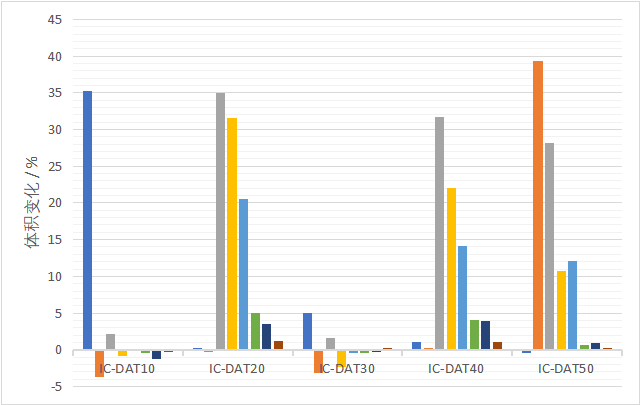 標(biāo)準(zhǔn)橡膠配方在這些液體中浸泡后的體積變化表明,大多數(shù)被測橡膠配方都有明顯的變化。可以看出,在所有的被測材料中,只有代碼為IC-DAT41的配方才是合適的候選配方。