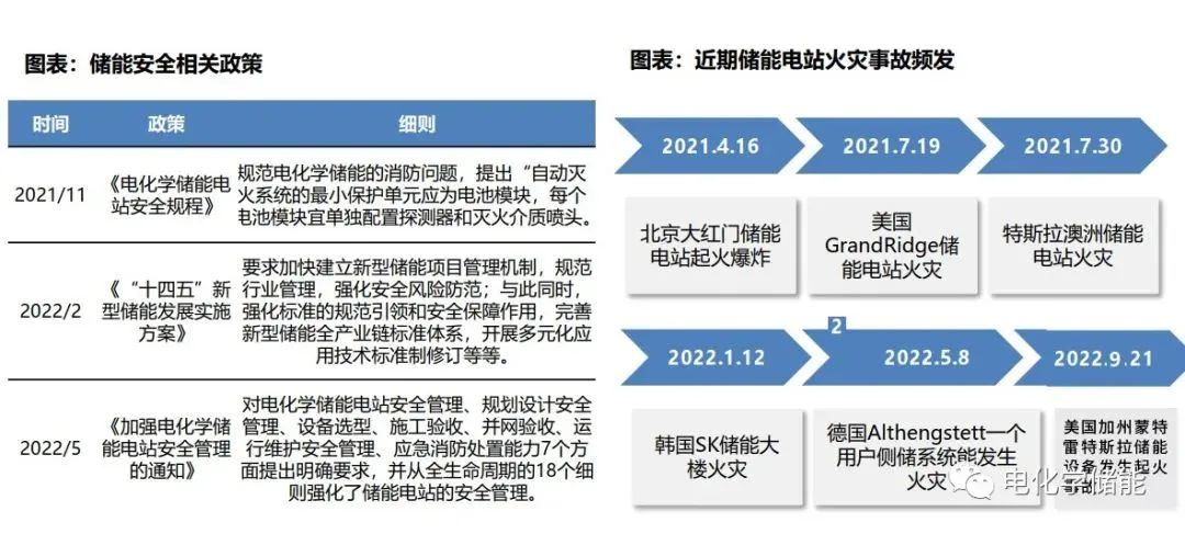 近年來,儲能電站火災頻發,溫控熱管理、儲能消防受到重視,行業政策接連出臺,儲能消防系統發展加速。鋰離子電池中金屬鋰是已知元素(包括放射性元素)中金屬活動性最強的,在汽車領域熱失控現象時有發生,給鋰電池在儲能上的應用埋下了安全隱患。據不完全統計,2022年全球已發生超17起儲能著火事故,2021年以來國家已經發布了多個涉及儲能消防安全的政策,新標準下儲能消防的重要性不斷突顯。