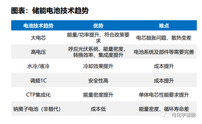 儲能電池材料體系以磷酸鐵鋰為主,電池向大容量方向持續演進。根據工信部要求,儲能型電池能量密度≥145Wh/kg,電池組能量密度≥110Wh/kg。循環壽命≥5000次且容量保持率≥80\%。當前的電化學儲能尤其是鋰電儲能技術進入了一個新變革周期,大電芯、高電壓、水冷/液冷等新產品新技術逐漸登上舞臺,儲能系統向大容量方向在持續演進,同時鈉離子電池在未來憑借成本優勢可能占據一席之位。