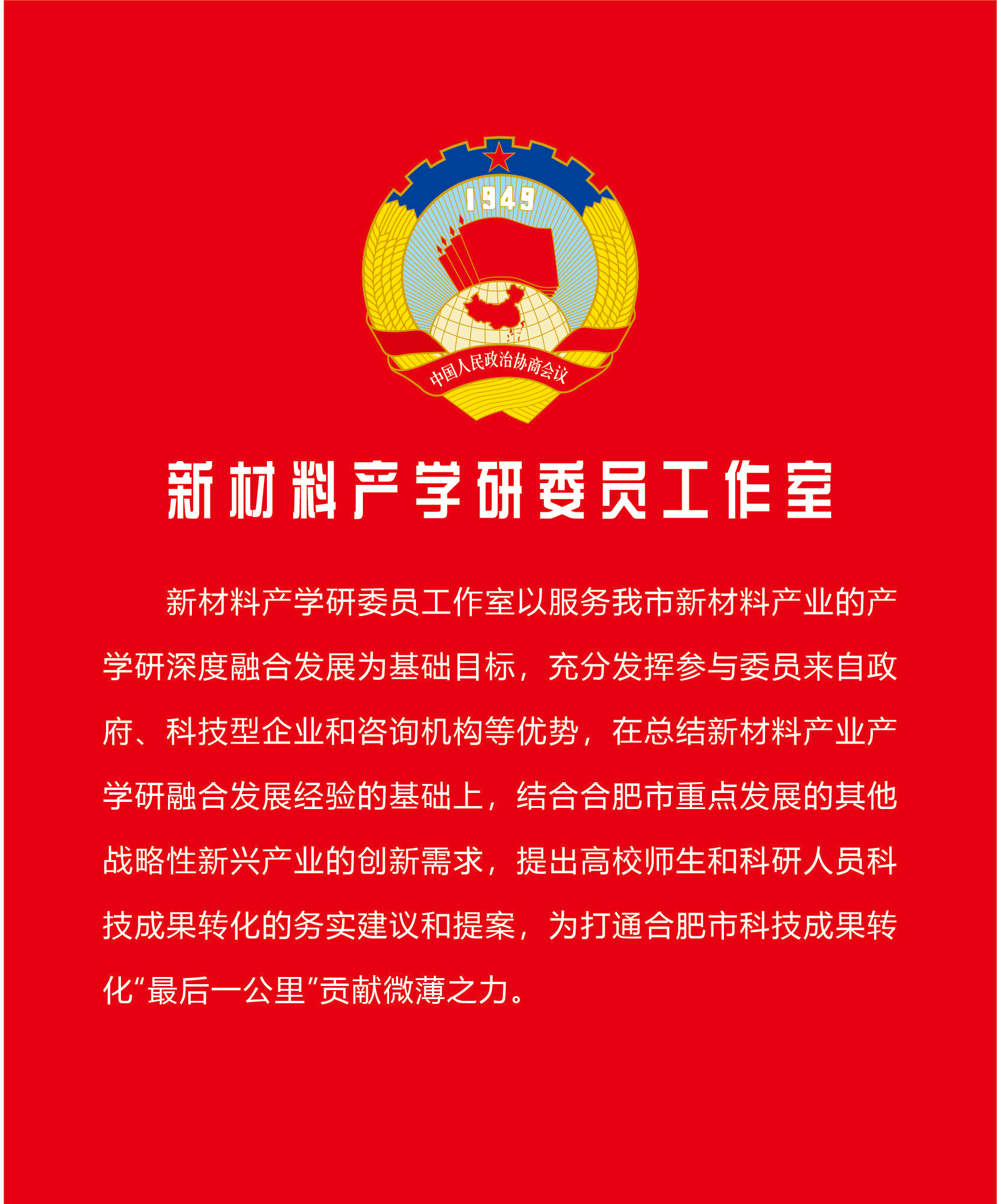 為進一步推動合肥新材料產業發展,由合肥市政協牽頭,以合肥華清表面處理基地為示范平臺,成立合肥新材料產學研委員工作室。合肥新材料產學研委員工作室將以服務合肥市新材料產業的產學研深度融合發展為基礎目標,充分發揮參與委員來自政府、科技型企業和咨詢機構等優勢,通過和中國科技大學、合肥工業大學和安徽大學等高校師生的互動,專注服務高校師生參與的中小型科技型企業和企業家、服務創新創業,從技術研發、科技成果轉化(特別是產品的中試環節)、初創科技企業管理、科技企業投融資、科技人才引進和激勵等不同角度,以多種方式為本市科技型中小企業發展助力。在總結新材料產業產學研融合發展經驗的基礎上,結合合肥市重點發展的其他戰略性新興產業的創新需求,提出高校師生和科研人員科技成果轉化的務實建議和提案,為打通合肥市科技成果轉化"最后一公里"貢獻微薄之力。