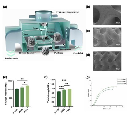 該研究采用了高溫氧化處理工藝,成功形成了鎂合金表面的氧化層和遷移層,從而有效減緩了3D打印鎂合金材料的降解速度。研究團(tuán)隊(duì)設(shè)計(jì)制備了孔徑分別為500微米、800微米和1400微米的鎂支架多孔支架(分別稱為P500、P800和P1400),并對其力學(xué)性能、生物相容性、降解行為和成骨能力進(jìn)行了體內(nèi)外的綜合評價。