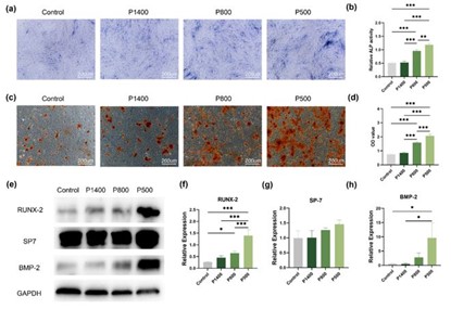 圖5:不同孔徑的鎂合金支架組體外促成骨能力測試:(a)堿性磷酸酶染色和(b) 堿性磷酸酶活性測試,(c-d)茜素紅染色及其半定量分析,(e-h) 成骨相關(guān)分子蛋白半定量分析結(jié)果