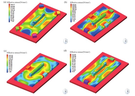 圖1不同夾緊方式的模擬結果(a) 夾緊方式 1; (b) 夾緊方式 2; (c) 夾緊方式 3; (d) 夾緊方式 4