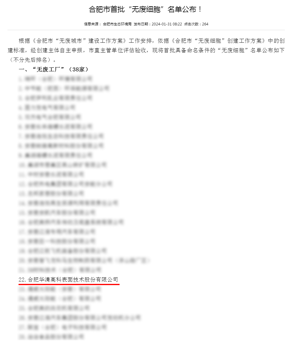 根據《合肥市“無廢城市”建設工作方案》工作安排,依據《合肥市“無廢細胞”創建工作方案》中的創建標準,經創建主體自主申報及市直主管單位評估驗收后,1月31日,合肥市生態環境局公布首批“無廢細胞”名單,合肥華清高科表面技術股份有限公司獲評“無廢工廠”稱號。
