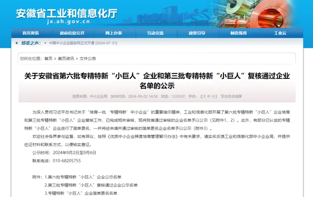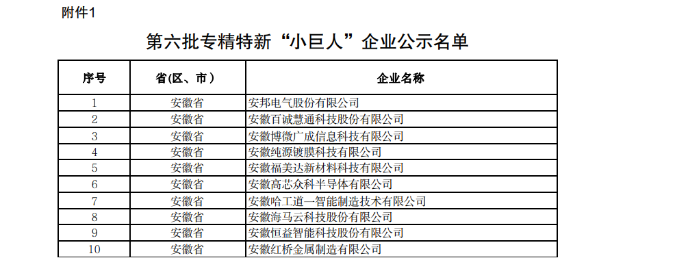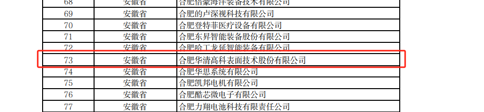 近日,安徽省工業和信息化廳公示“安徽省第六批國家級專精特新‘小巨人’企業和第三批專精特新‘小巨人’復核企業名單”,合肥華清高科表面技術股份有限公司順利通過國家級專精特新“小巨人”企業認定。